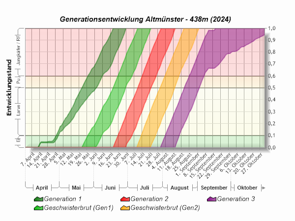 gleichfarbige Linien repräsentieren den minimalen und maximalen Entwicklungsverlauf der jeweiligen Generation