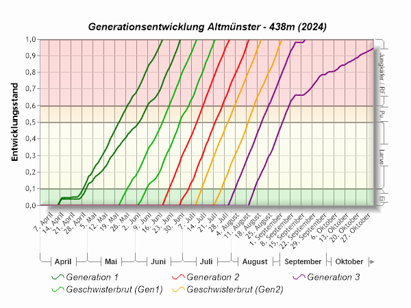 gleichfarbige Linien repräsentieren den minimalen und maximalen Entwicklungsverlauf der jeweiligen Generation