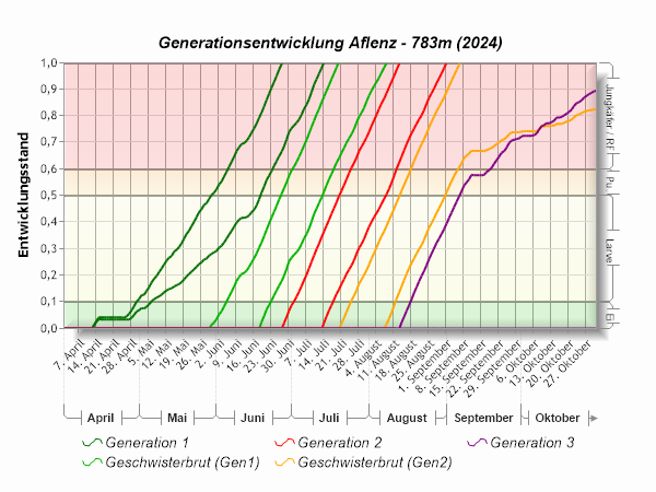 gleichfarbige Linien repräsentieren den minimalen und maximalen Entwicklungsverlauf der jeweiligen Generation