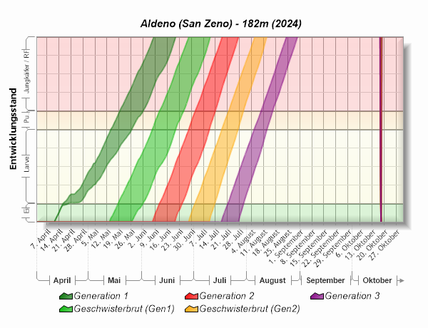 gleichfarbige Linien repräsentieren den minimalen und maximalen Entwicklungsverlauf der jeweiligen Generation