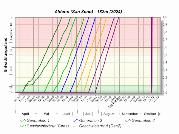 gleichfarbige Linien repräsentieren den minimalen und maximalen Entwicklungsverlauf der jeweiligen Generation